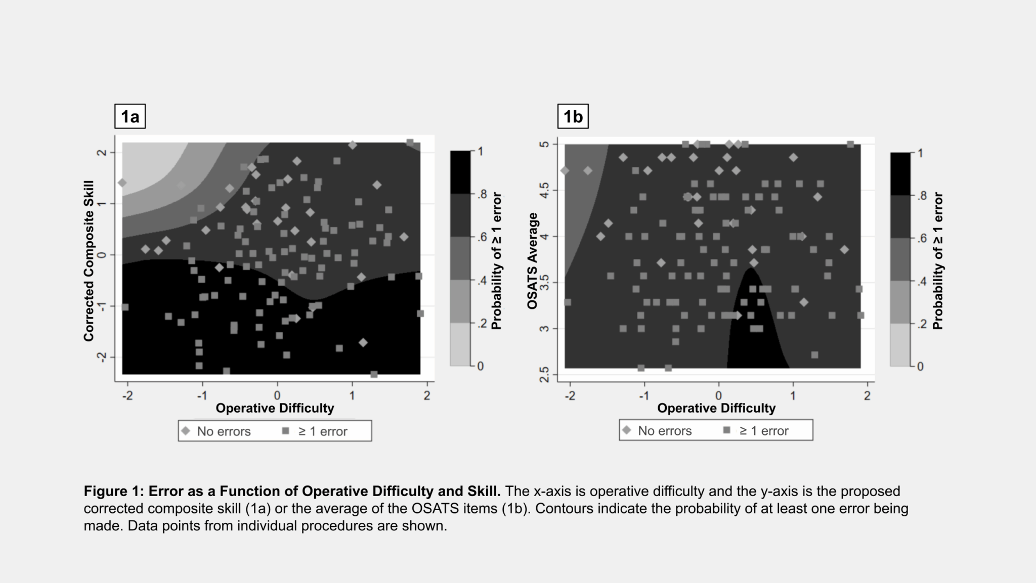 A latent, weighted skill score from OSATS items, adjusted for rater effects and operative difficulty, predicts intraoperative error. Averaging OSATS is insufficient to model the probability of intraoperative error.